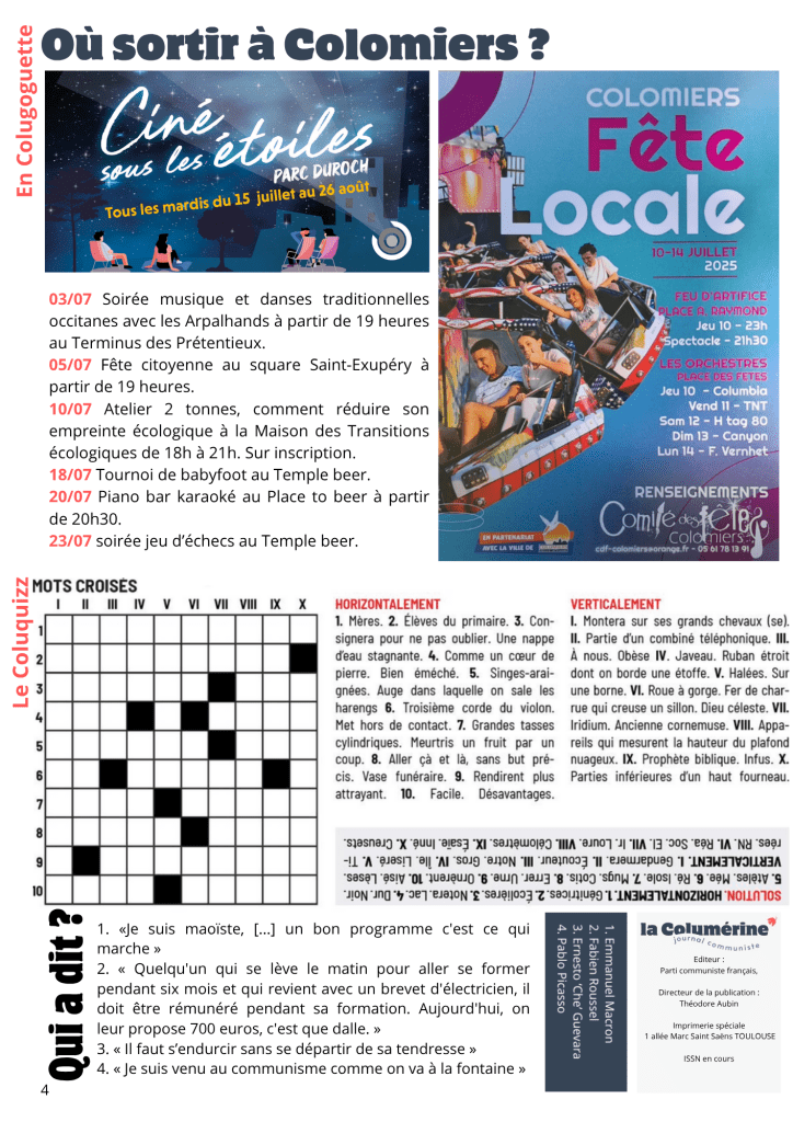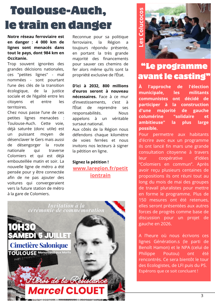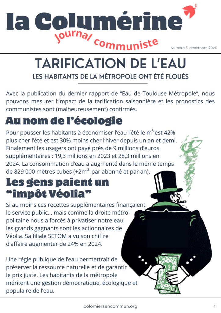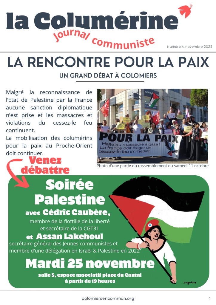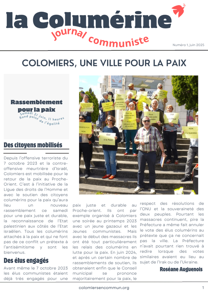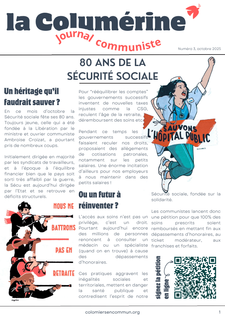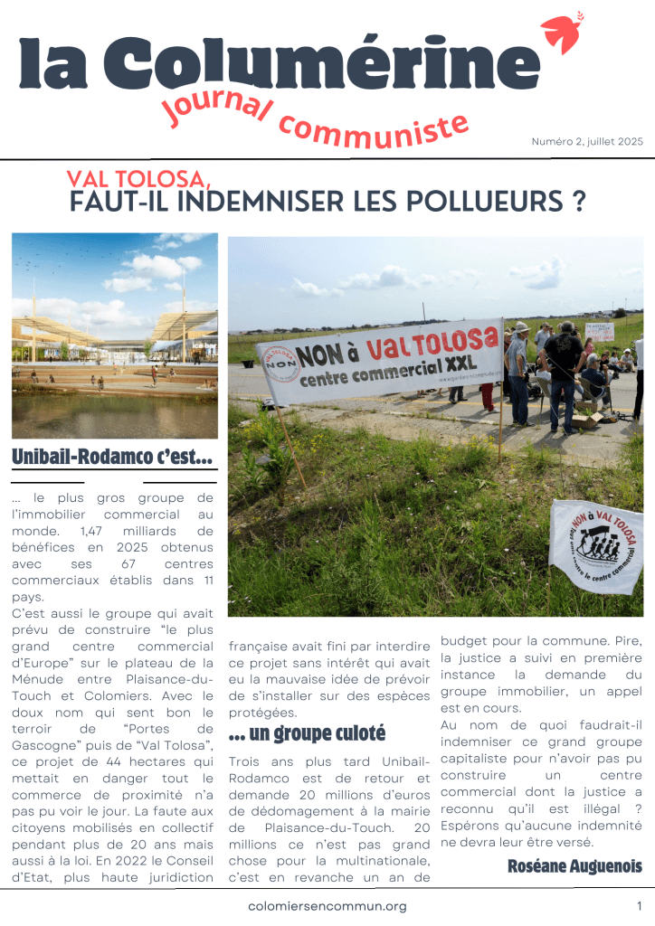 La Columérine c’est le journal communiste de Colomiers, vous y retrouverez tous les mois l’actualité de votre ville, les luttes de ses habitants et nos propositions pour la commune. Depuis 2025 elle remplace nos anciens journaux, Le Colucoco et Les Nouvelles de l’Ouest.