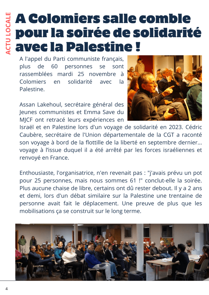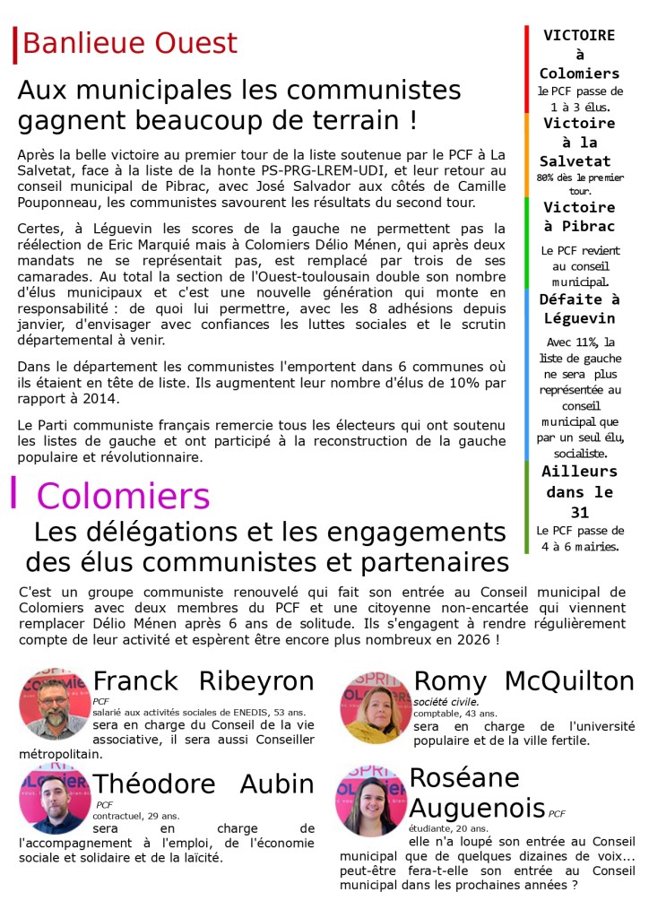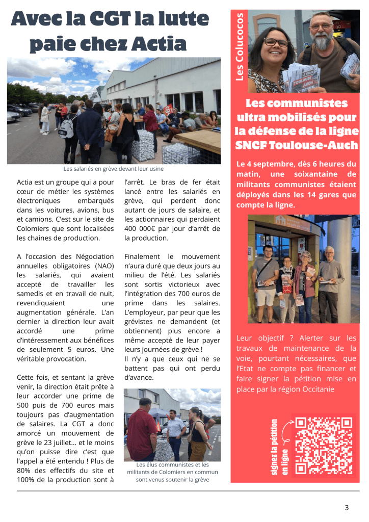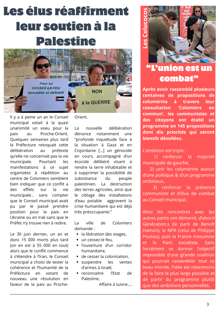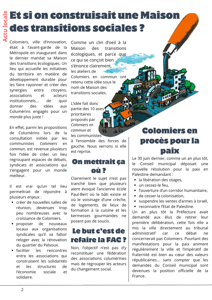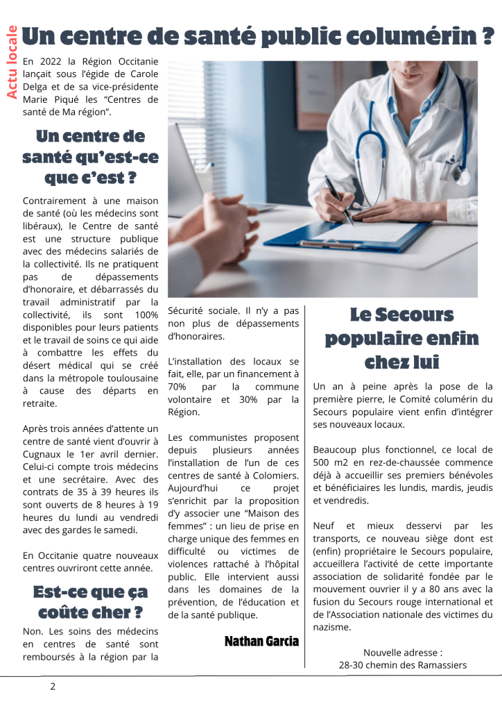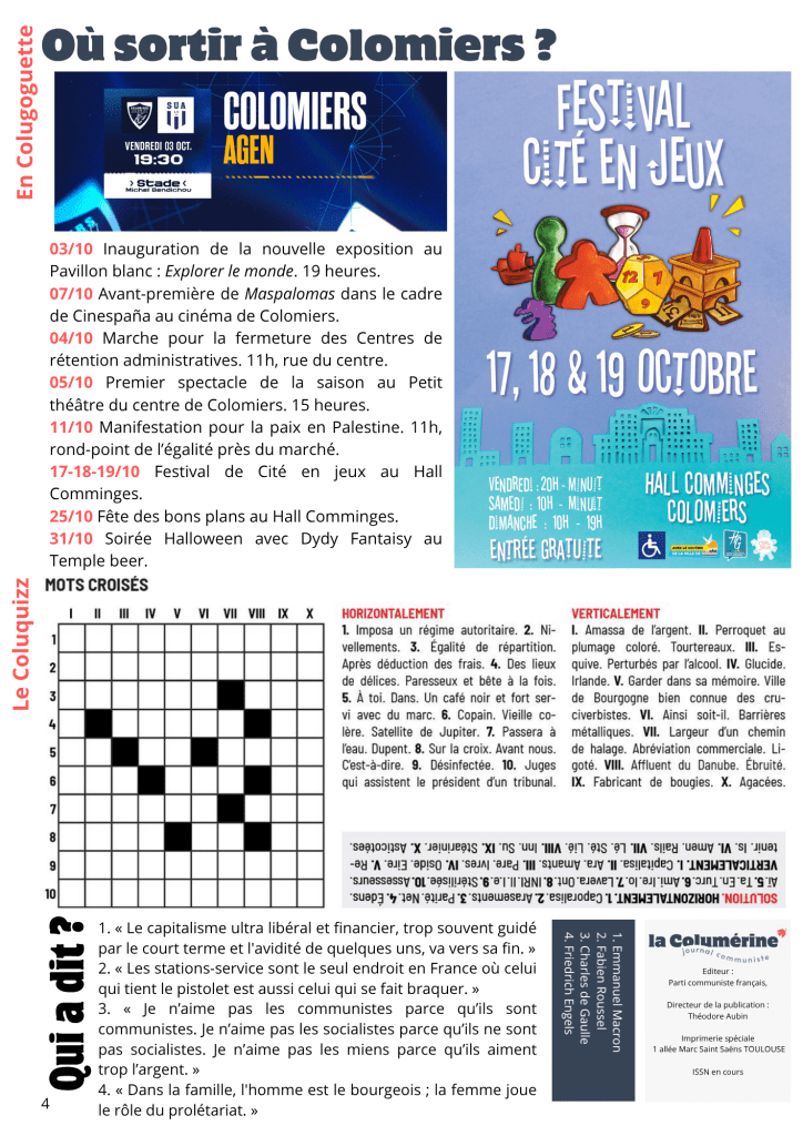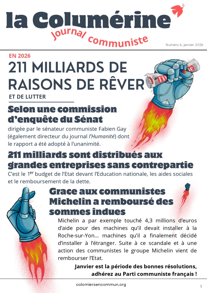 La Columérine c’est le journal communiste de Colomiers, vous y retrouverez tous les mois l’actualité de votre ville, les luttes de ses habitants et nos propositions pour la commune. Depuis 2025 elle remplace nos anciens journaux, Le Colucoco et Les Nouvelles de l’Ouest.
